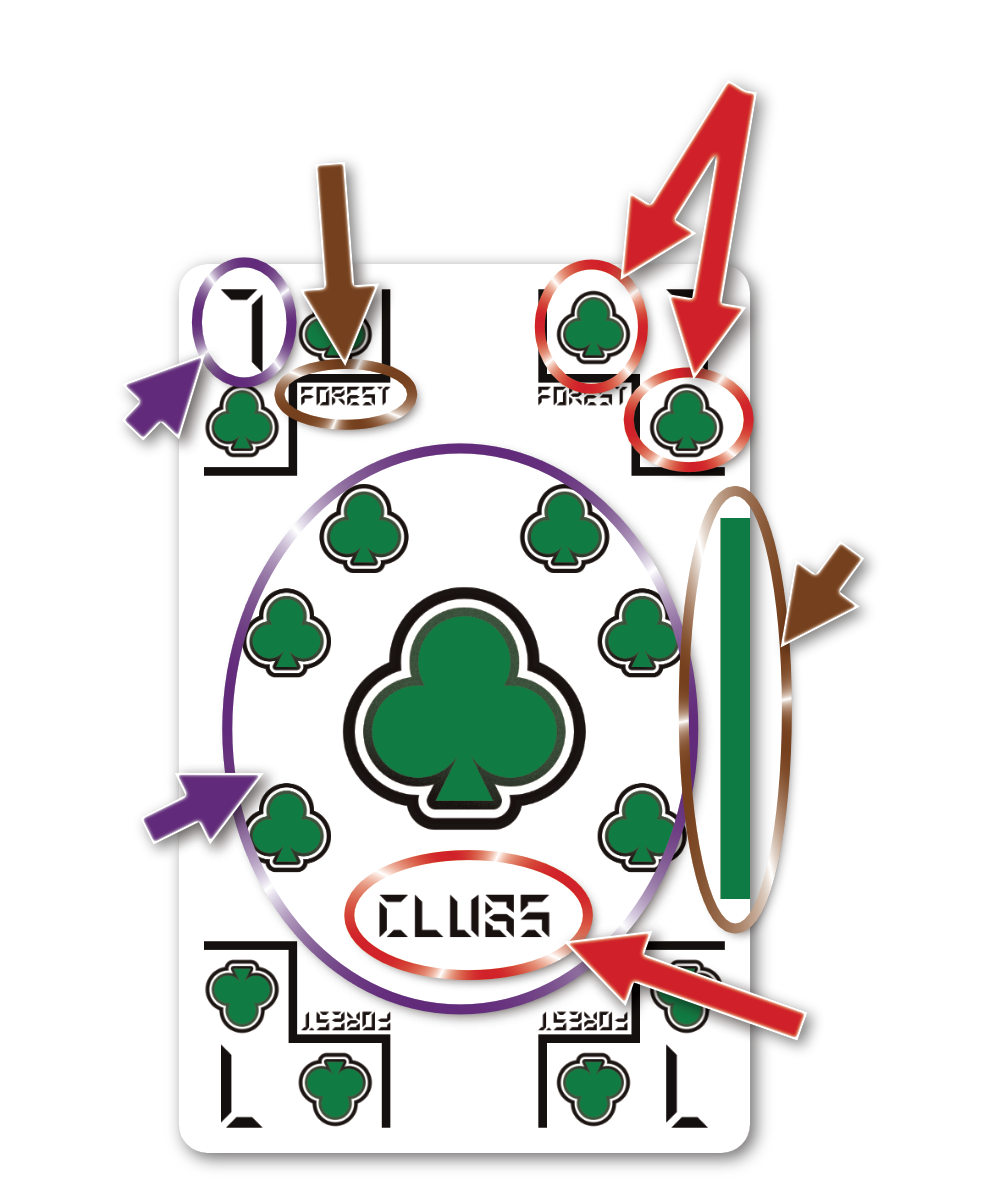 Outside of the 24 alphabetical are the 4 Ecwem Suits or wild suits. Ecwems sits atop the hierarchy, while [ ] or "blanks" sits at the bottom. Ecwem and [ ] are used as wilds for every suit. Ecwem Reds is the top of the red suit cards, with Ecwem Blacks atop the black suit cards. Ecwem Reds are only wild for red suits, while Ecwem Black are only wild for black suits. Having a hand of 4 Spades with an Ecwem Red does not give a player a flush, the player would still need another spade or different Ecwem Suit. Unique to the two suits, Ecwem Reds and Ecwem Blacks may be discarded where other wilds may not be.