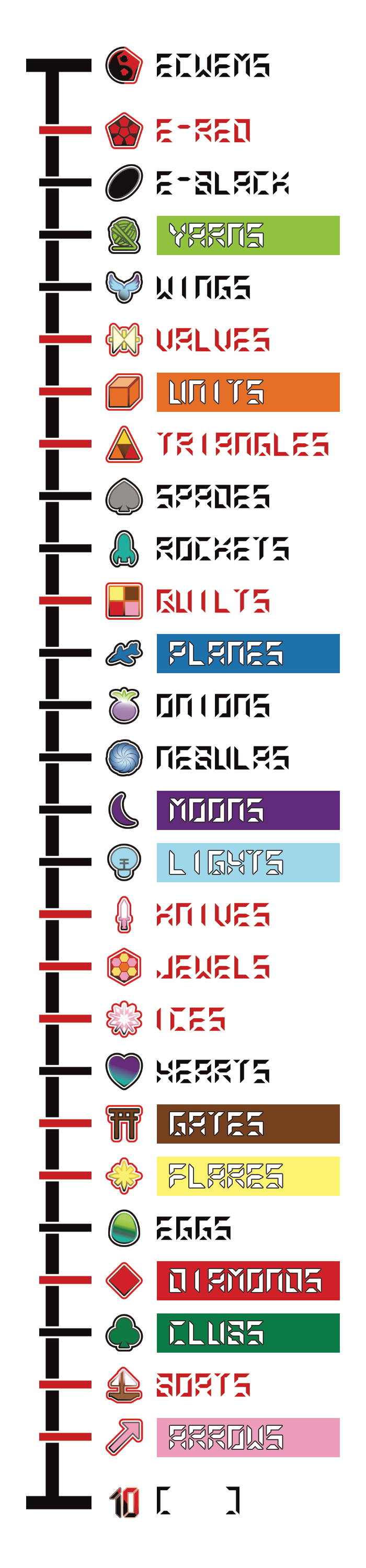 The letters are used for card games with a hierarchy. For a traditional playing card deck the hierarchy highest to lowest is Spades, Hearts, Diamonds, Clubs or reverse alphabetical. The Ecwem deck uses the same method highest to lowest are reverse alphabetical. Similarly to the traditional playing card deck, the alphabetical suits are divided into red or black with 12 suits in each. Red suits have sharp edges and use warm colors, black suits have rounded edges and use cool colors.